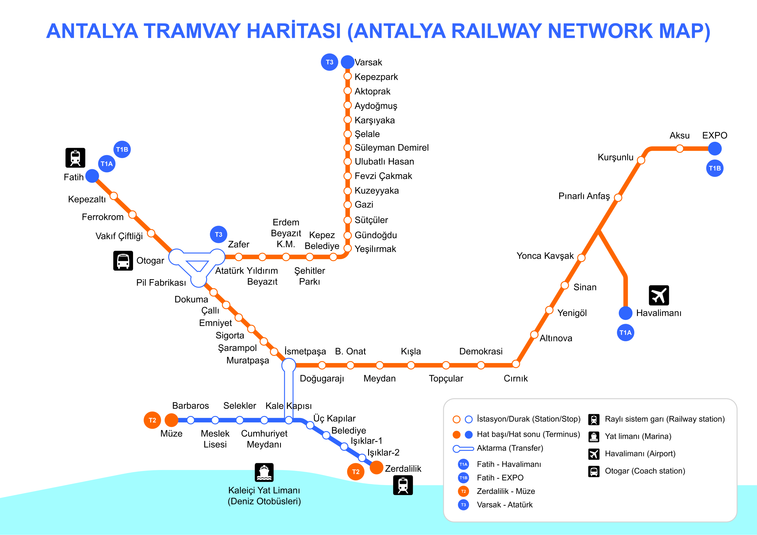 Both cities are covered by a dense network of public buses. Payment is with a contactless card or Antalyakart. Some key routes for tourists include: